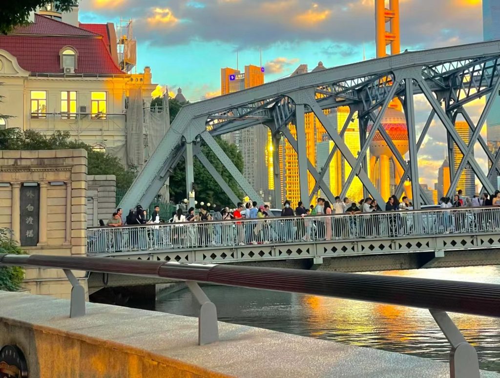Unlike the main Bund promenade, this area is noticeably calmer. The steel structure of the bridge, long featured in historical photographs, frames a multi-layered cityscape: waterways below, historic façades nearby, and modern towers receding into the distance. For travelers seeking moments of reflection rather than crowds, this is an ideal place to pause—camera optional, observation essential.